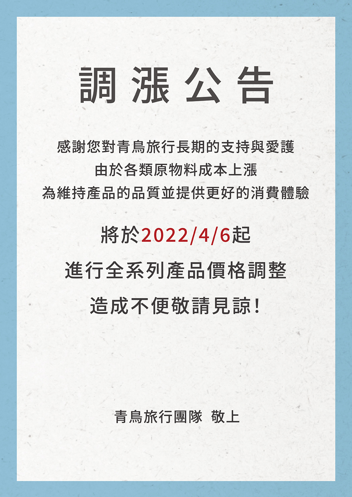 【青鳥旅行調漲公告】